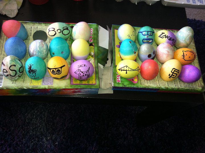 Easter is one of my favorite holidays because I love dyeing eggs, then making egg salad sandwiches after. This year 10 of us combined forces to color 2 dozen eggs- there were glitter, tie-dye, SF, Hello Kitty, & even a Paul Wall egg! And most importantly, now I have some good home lunch for the rest of the week :)